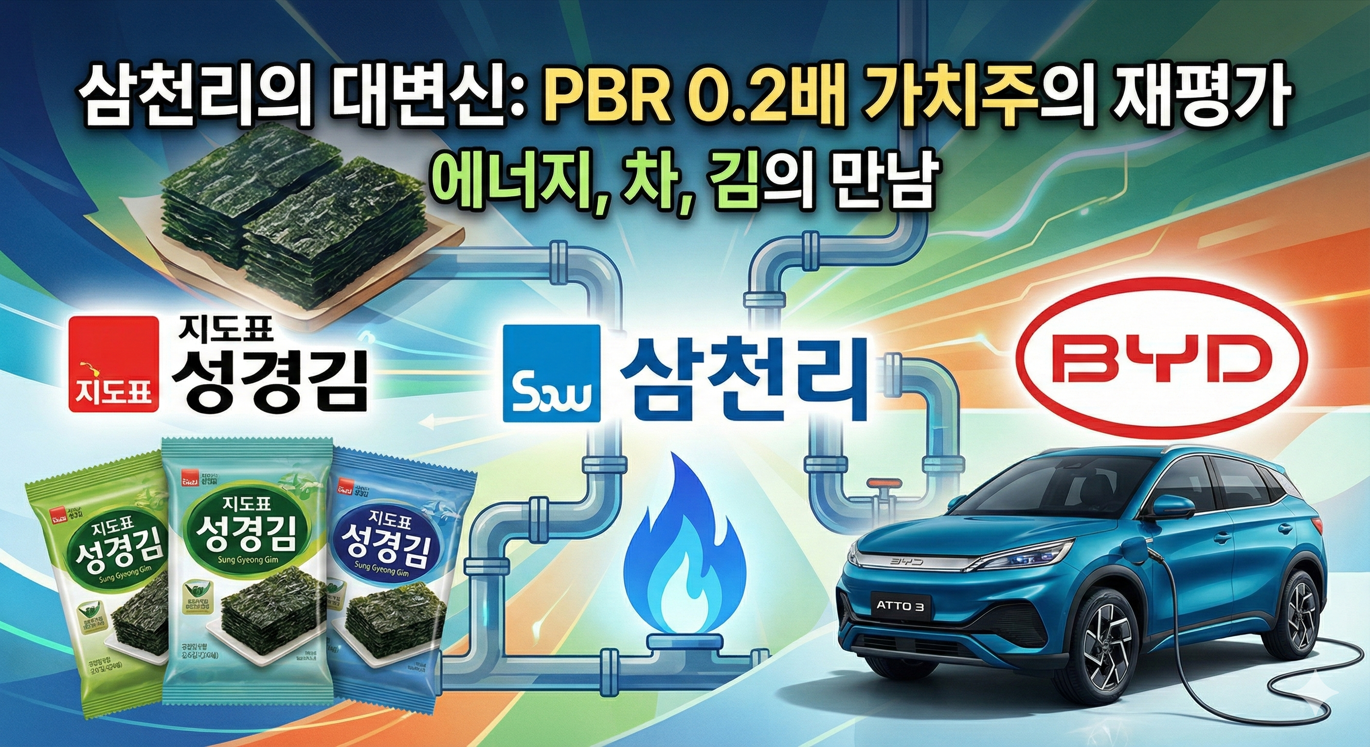 오늘은 국내 대표적인 자산주이자 '만년 저평가'의 대명사, 삼천리(004690)를 심층 분석해보려 합니다. 최근 삼천리는 시장에서 아주 흥미로운 두 가지 움직임을 보여주었습니다. 먼저 BYD의 딜러권을 확보함으로써 사업 모델을 모빌리티 영역까지 확장했으며, 최근에는 검은 반도체라고 불리는 김을 제작하고 있는 '지도표 성경김'을 인수해서 K-푸드까지 사업을 넓히고 있다는 소식입니다. 단순히 도시가스 고지서만 보내던 회사가 아닙니다. PBR 0.3배 수준의 극저평가 구간에서 새로운 성장 엔진을 장착한 삼천리의 투자 포인트를 사업 구조, 재무 시뮬레이션, 리스크 관점에서 정리해 드립니다.