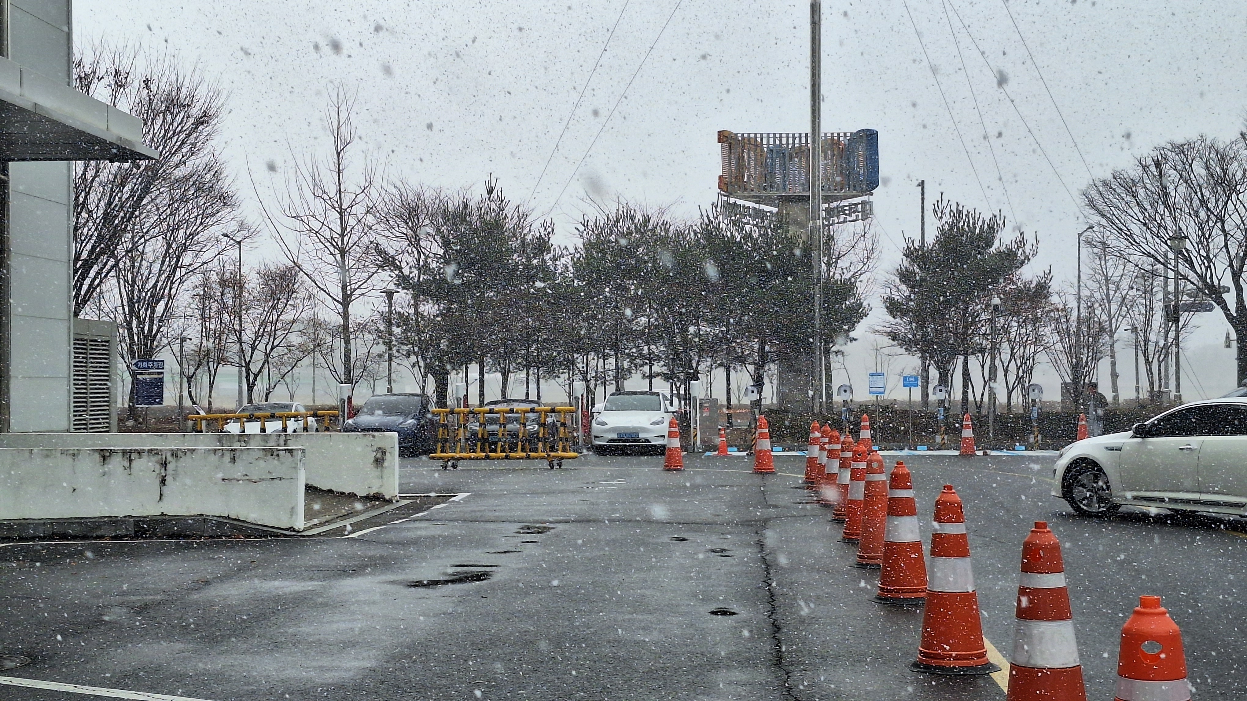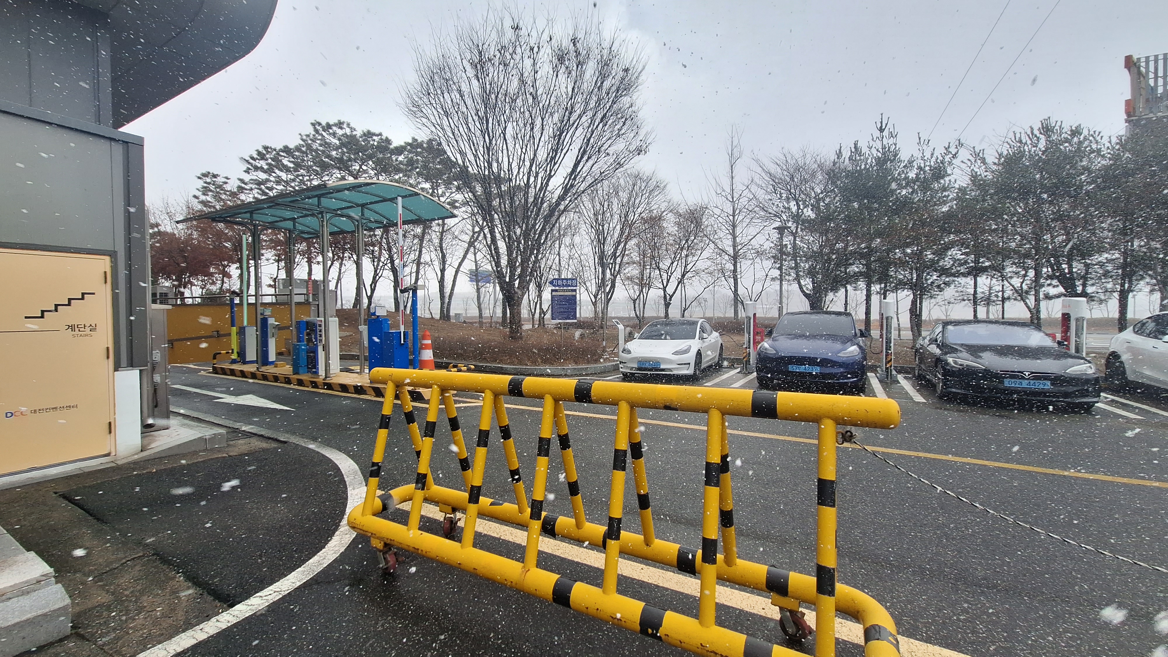 총 4기만 설치되어 있어 지상주차장에 대기하고 있는 차량도 있을 수 있습니다. 테슬라 네비게이션에서 슈퍼차저 여유 현황을 파악하신 후에 출발하시는 것을 추천드려요.